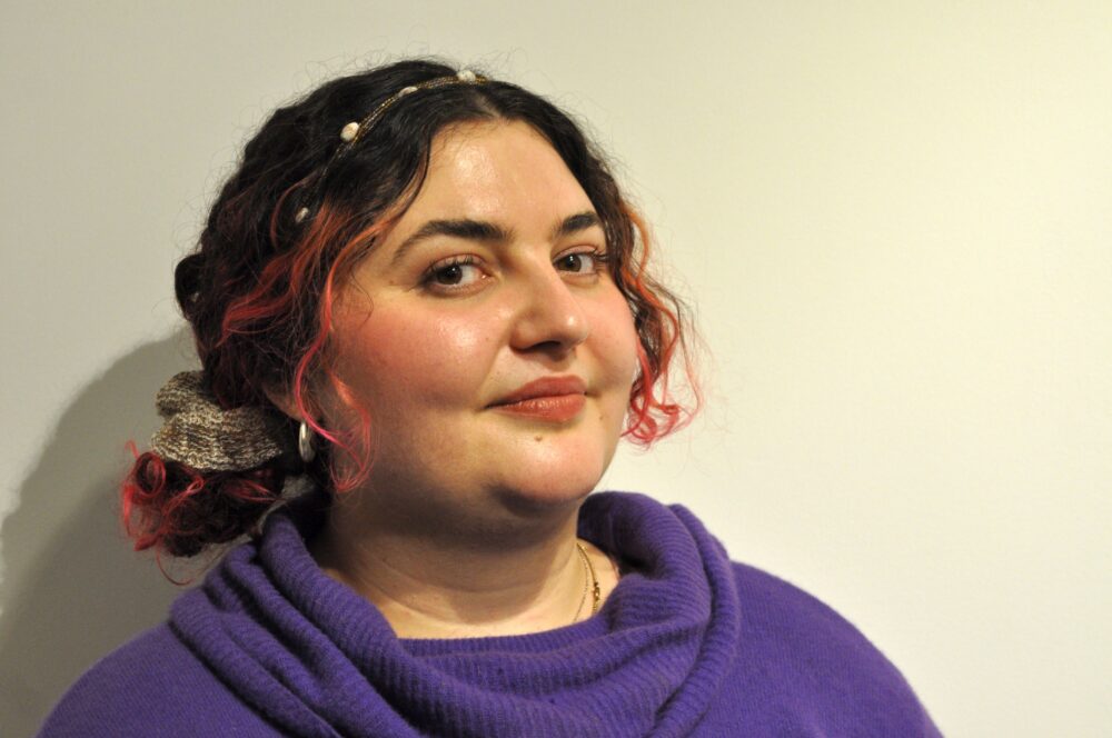 Dankó Boglárka Heresy in the small hours kiállításán hímzések, gyöngyök, flitterek és díszítőelemek kollázsszerűen töltik meg a kompozíciós felületeket
